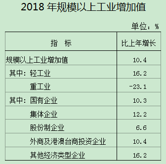 2018年末,全市规模以上工业企业数达到930户,全年累计实现规模以上工业增加值同比增长10.4%,增速创4年来新高。分经济类型看:国有企业、股份制企业和外商及港澳台投资企业增长较快,分别增长16.2%、10.3%和12.2%。分行业看:统计的33个行业大类中有24个行业增加值实现增长;在增加值达到15亿元的行业中,酒、饮料和精制茶制造业、非金属矿物制品业橡胶和塑料制品业增长较快,增幅分别达到43.7%、10.2%和18.9%。规模工业全年实现主营业务收入1174.5亿元,增长11.6%,实现利税86.7亿元,与上年基本持平。规模以上工业统计的产品产量中,锂离子电池增长41.0倍,钢材增长1.4倍,白酒增长18.4%,电动自行车增长16.8%,自来水生产量增长10.9%,胶合板增长8.0%,铁矿石原矿量增长0.9%,家用电冰箱下降7.1%,发电量下降1.6%。