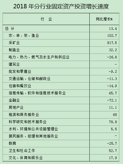 2018年全年完成固定资产投资比上年增长13.4%。分产业看,第一产业投资增长102.7%;第二产业投资增长18.8%;第三产业投资增长10.2%。