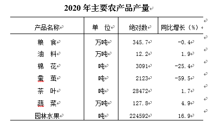2020年,全市粮食种植面积609.1千公顷,比上年增加1.45千公顷;油料种植面积53.1千公顷,比上年增加0.4千公顷;棉花种植面积4.1千公顷,比上年减少0.7千公顷;蔬菜种植面积56.2千公顷,比上年增加2.4千公顷。全年粮食产量345.7万吨,下降0.4%;油料产量12.2万吨,增长1.9%;棉花产量3091吨,下降25.4%。