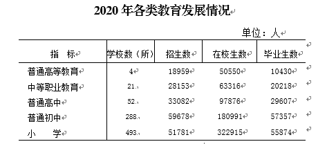 2020年末,全市普通高校4所,当年招生18959人,比上年下降2.85%;在校生50550人,增长8.26%;毕业生10430人,下降9.77%。各类中等职业教育学校21所(不含技工学校),当年招生28153人。普通高中52所,招生33082人,高中阶段毛入学率119.44%。普通初中288所,招生59678人,初中学龄人口入学率为99.99%。小学493所,招生51781人,小学入学率为100%。