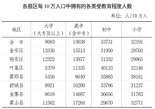 根据六安市第七次全国人口普查结果,现将2020年11月1日零时全市的人口受教育基本情况公布如下: